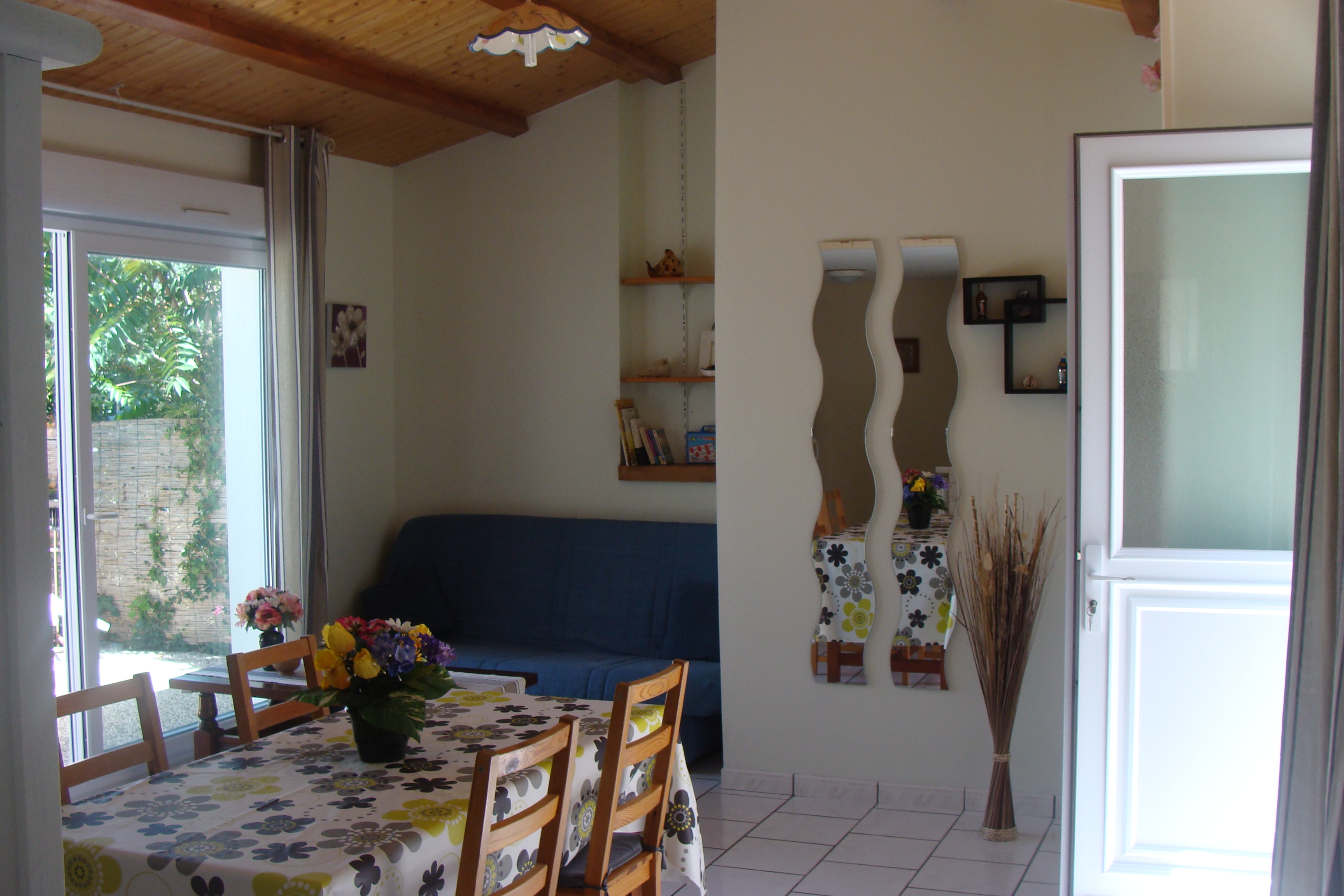 Séjour : canapé convertible, 2 places (bonne literie), commode, télévision, bibelots, meuble vaisselle, baie vitrée avec volet roulant électrique donnant sur la cour.